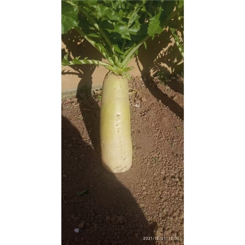 改良品种晚熟萝卜,叶丛直立,株高50公分左右,花叶有毛,裂叶13-15片肉质根长圆柱形,长30-50公分,2/3露外面,为青黄色,下部白色,单重0.7-1.5公斤,生长期120天,耐糠心。